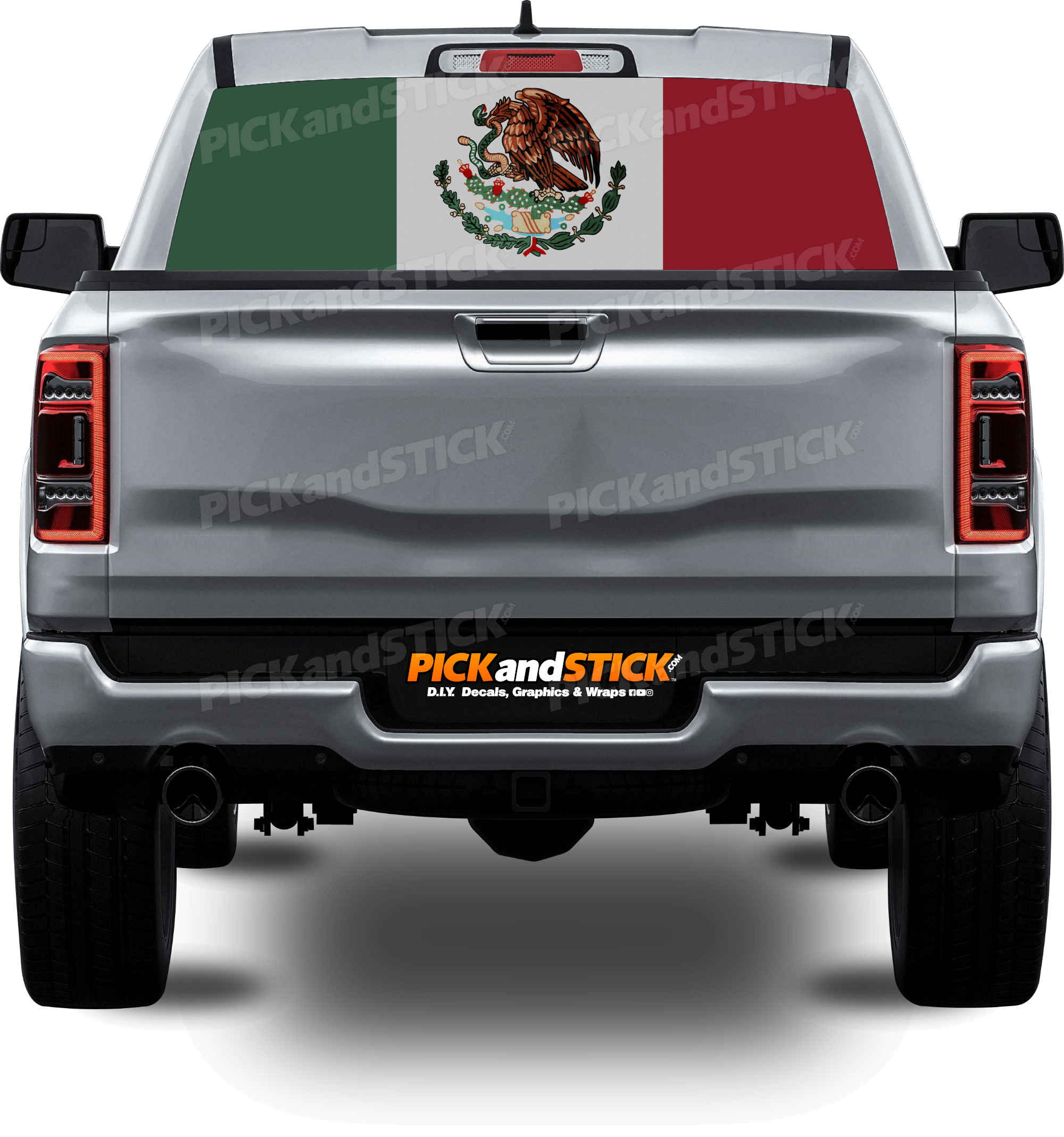 Mexico Flag rear window perforated graphic decal is produced with 50/50 perforated vinyl that provides one-way vision.
