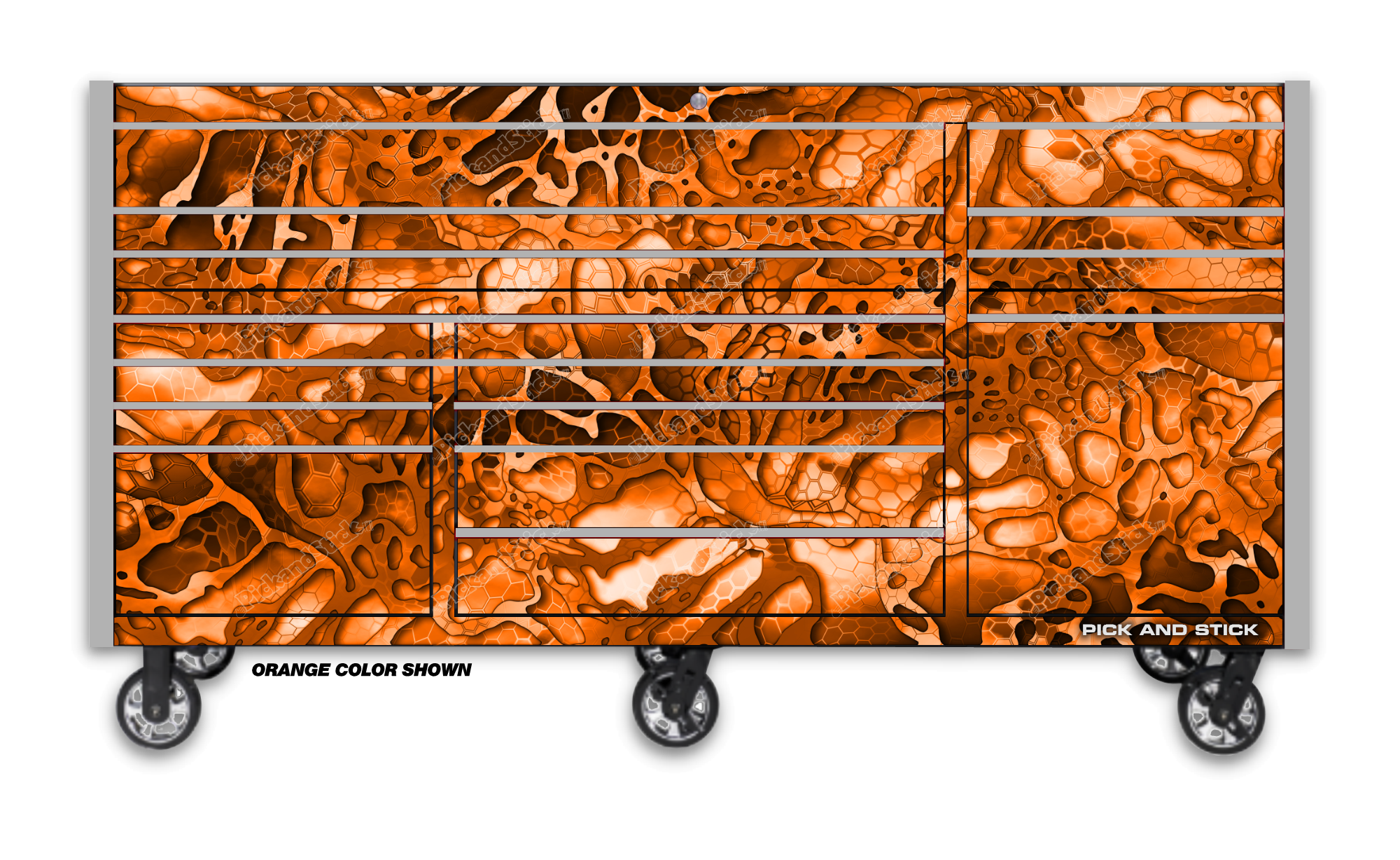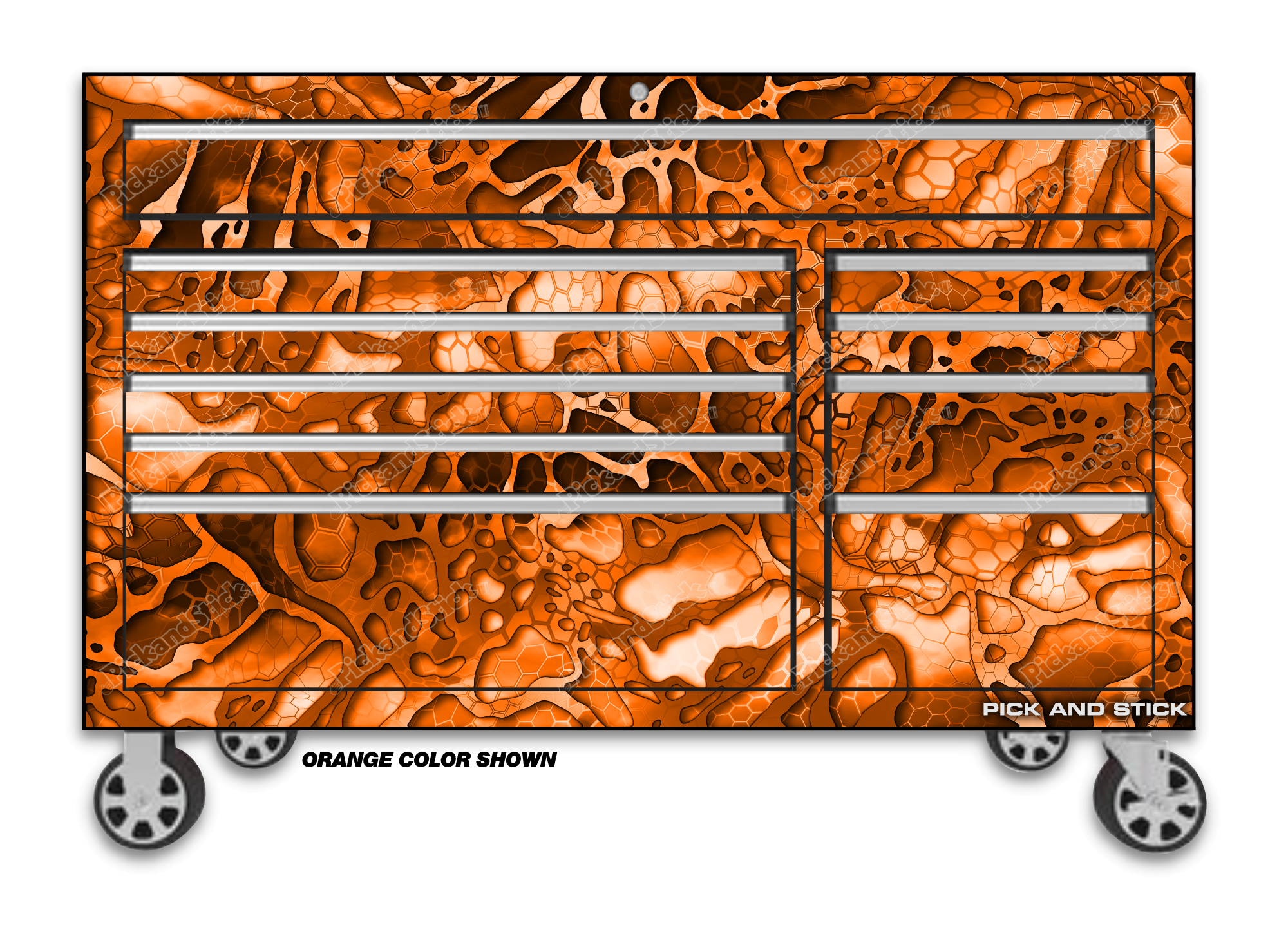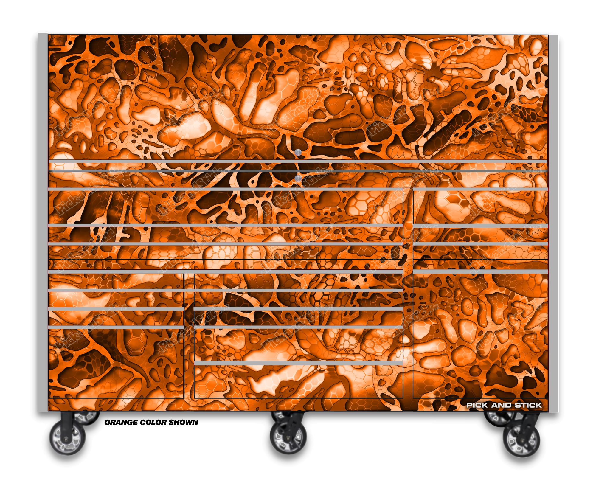 Broken 5 Camo Orange Toolbox Wrap are printed with 3M MCS Certified HP Latex printers on industry-leading premium 3M wrap vinyl. All graphics are covered with a clear laminate to provide long term durability and UV protection against fading and are removable. You can easily trim to fit for a simple installation. If you need a custom size Contact Us.