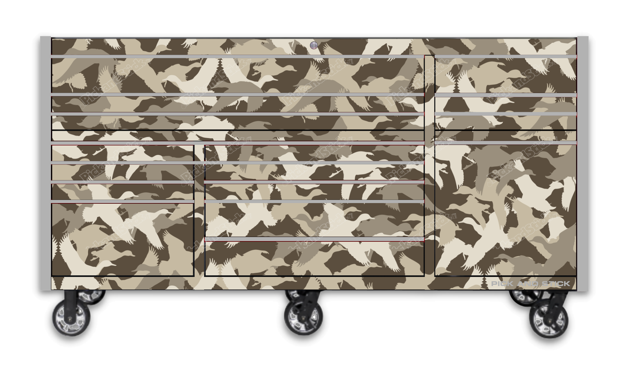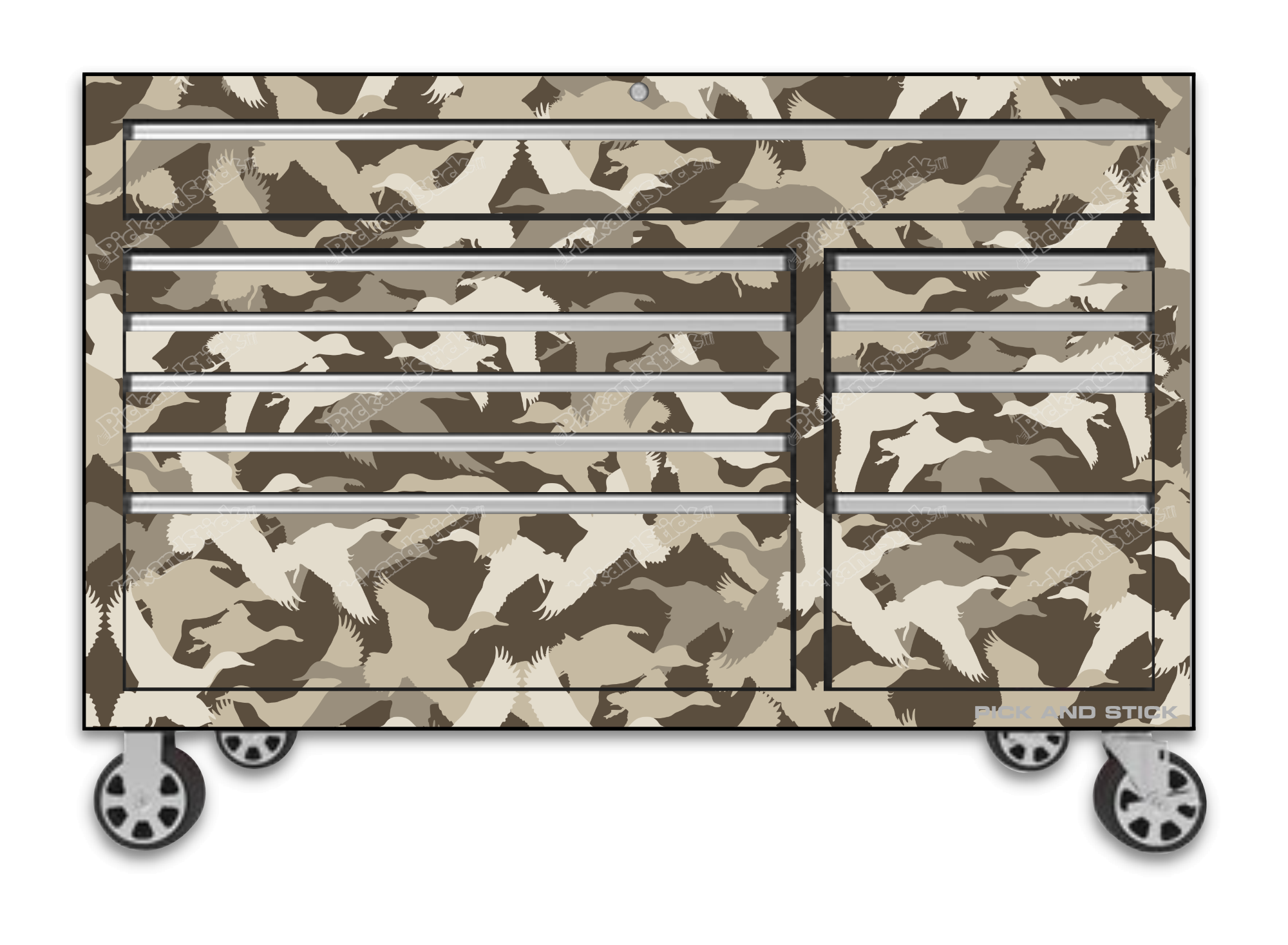 Duck Silhouette Camo Toolbox Wrap are printed with 3M MCS Certified HP Latex printers on industry-leading premium 3M wrap vinyl. All graphics are covered with a clear laminate to provide long term durability and UV protection against fading and are removable. You can easily trim to fit for a simple installation. If you need a custom size Contact Us.