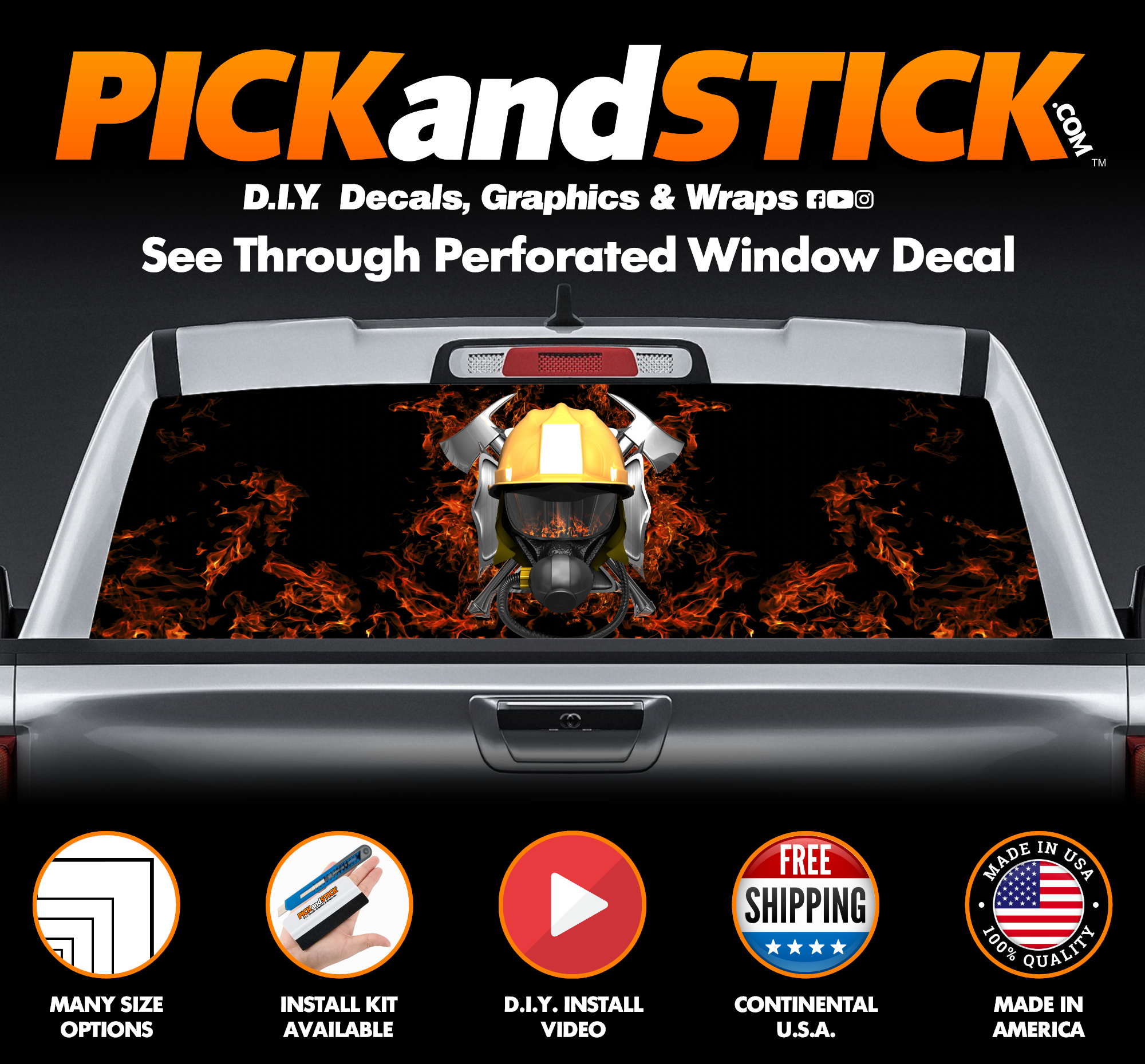 Fire Fighter Helmet I rear window perforated graphic decal is produced with 50/50 perforated vinyl that provides one-way vision.