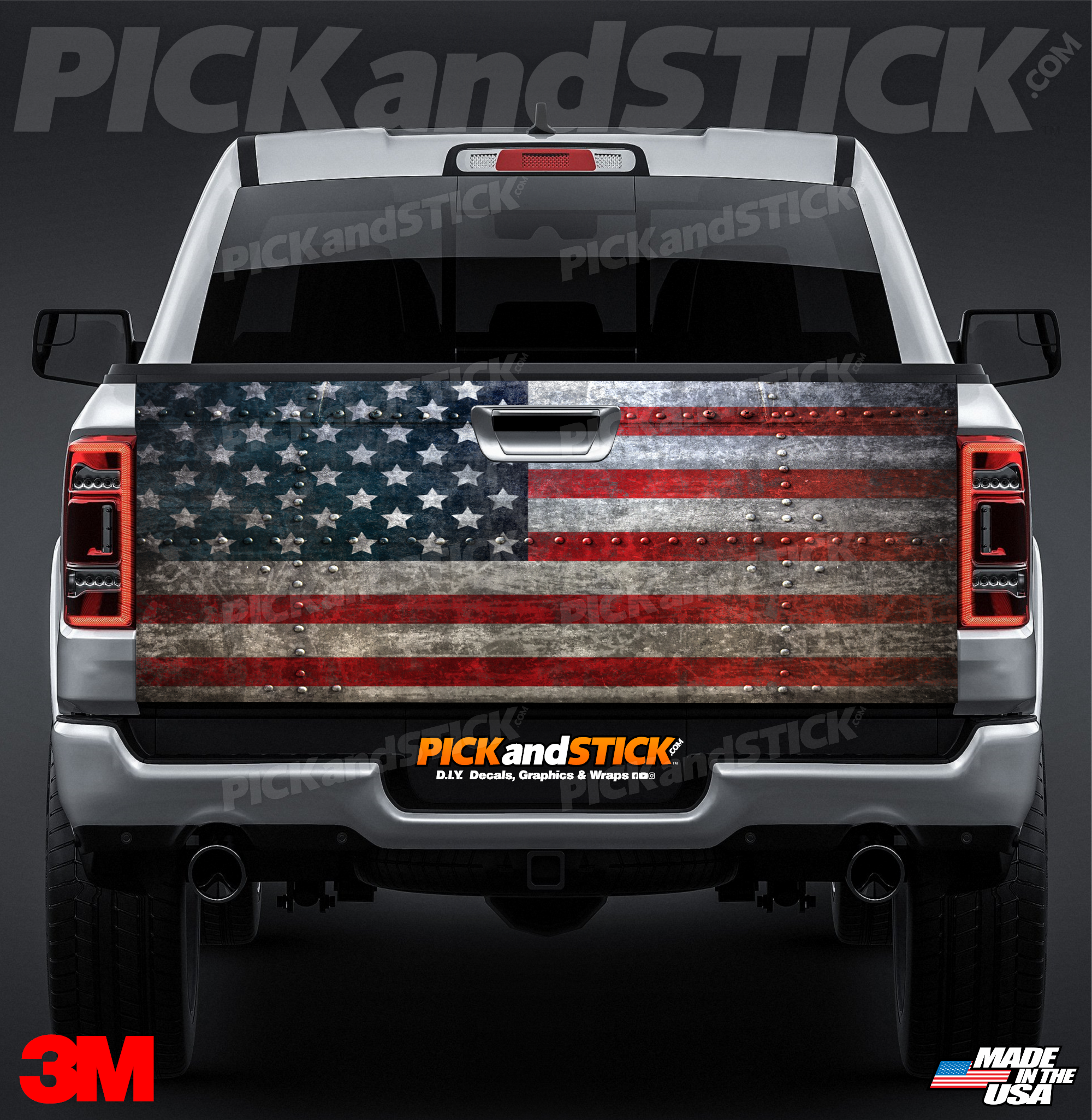 American Metal Riveted Flag Tailgate Wrap by Pick and Stick is printed with 3M MCS Certified HP Latex printers on industry-leading 3M wrap vinyl.