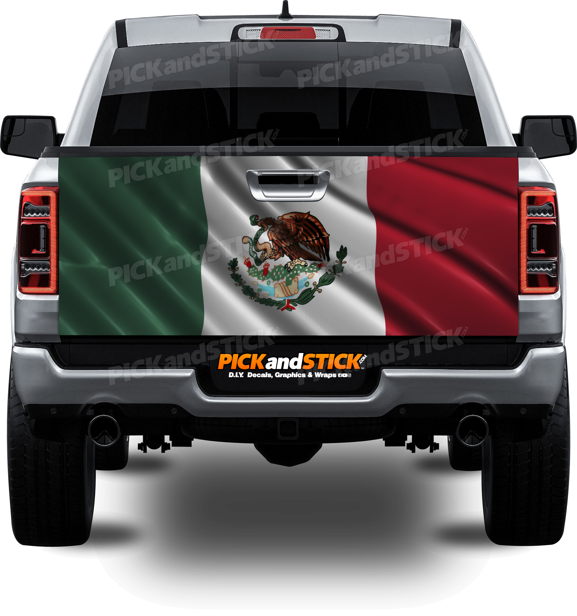 Mexican Flag Heavy Waving Tailgate Wrap by Pick and Stick is printed with 3M MCS Certified HP Latex printers on industry-leading 3M wrap vinyl.